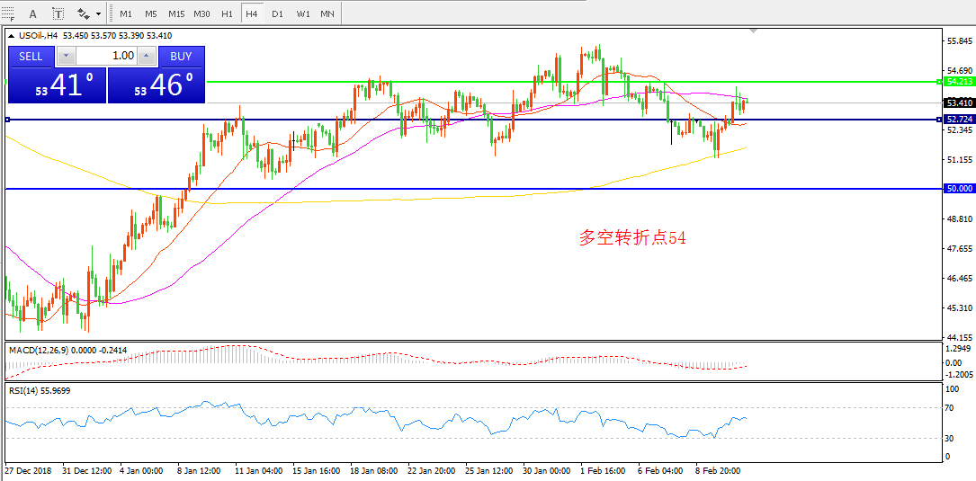 4小时图看,油价均线形成死叉后震荡下行,昨日触及200日均线支撑出现反弹,目前受制于上方55均线阻力附近。 MACD绿柱缩短,短期走势预计在52-54美元之间震荡为主。