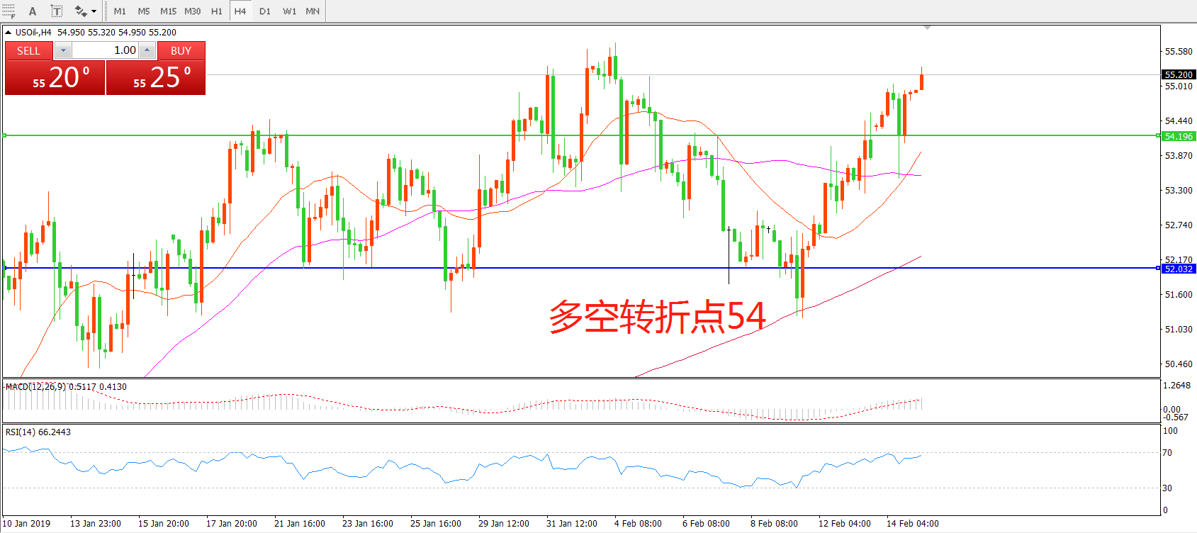 4小时图看,油价回踩200日均线后出现反弹, 21均线拐头向上形成金叉,MACD红柱增加,日内继续上行概率较大。