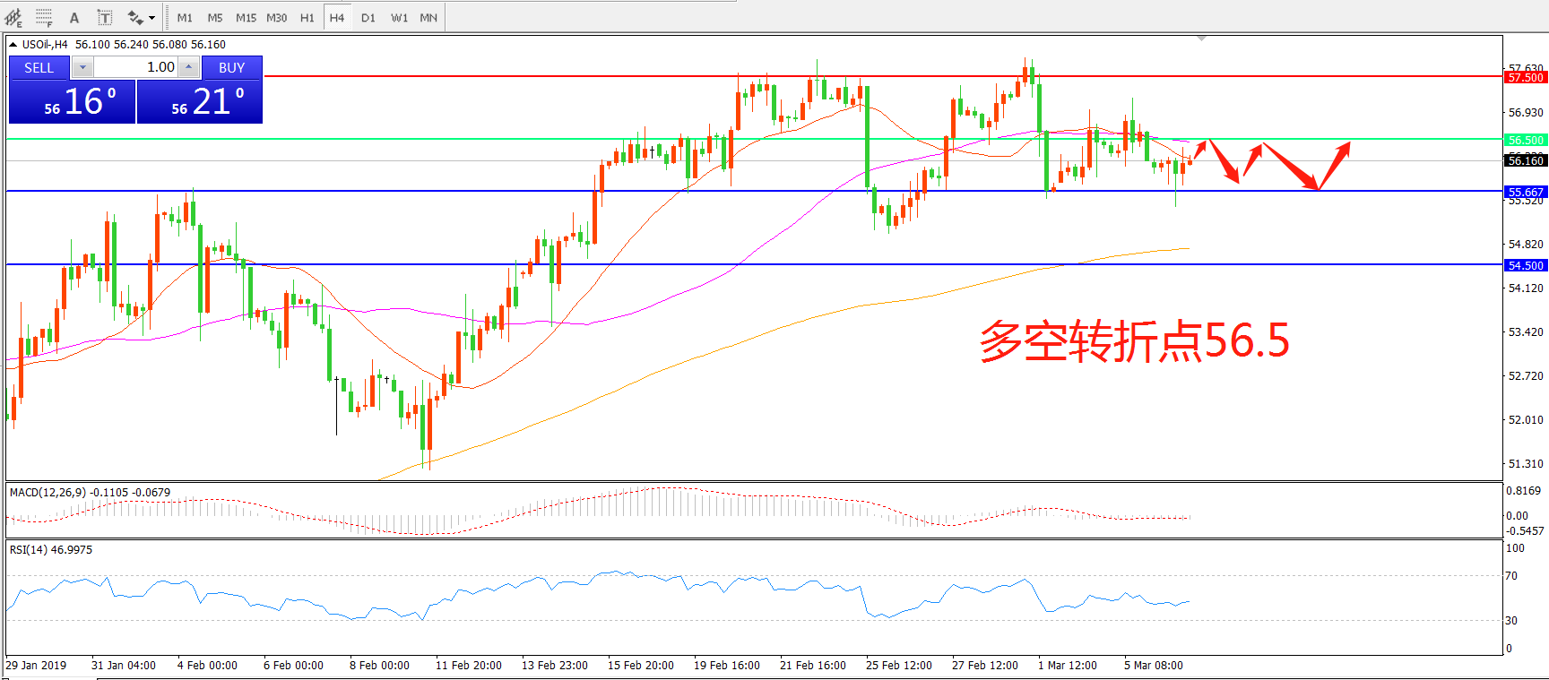 交易策略:在56.50  之下看跌,目标55.60   54.50