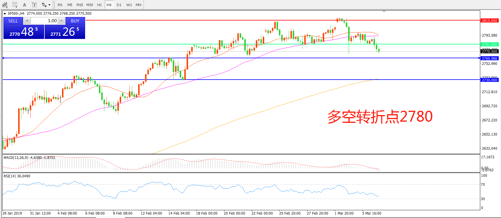 4小时图看,标普500触及55周期均线后震荡下行,2781支撑跌破后,整体走势偏空。21均线与55均线有形成死叉迹象, MACD红柱减少,RSI指标下行,短期下行概率较大。