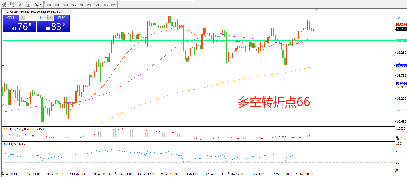 4小时图看,油价触及200周期均线附近连续反弹,触碰67阻力后小幅回落,短期走势依然偏强,均线系统粘合形成支撑,MACD红柱增加,日内震荡上行概率较大