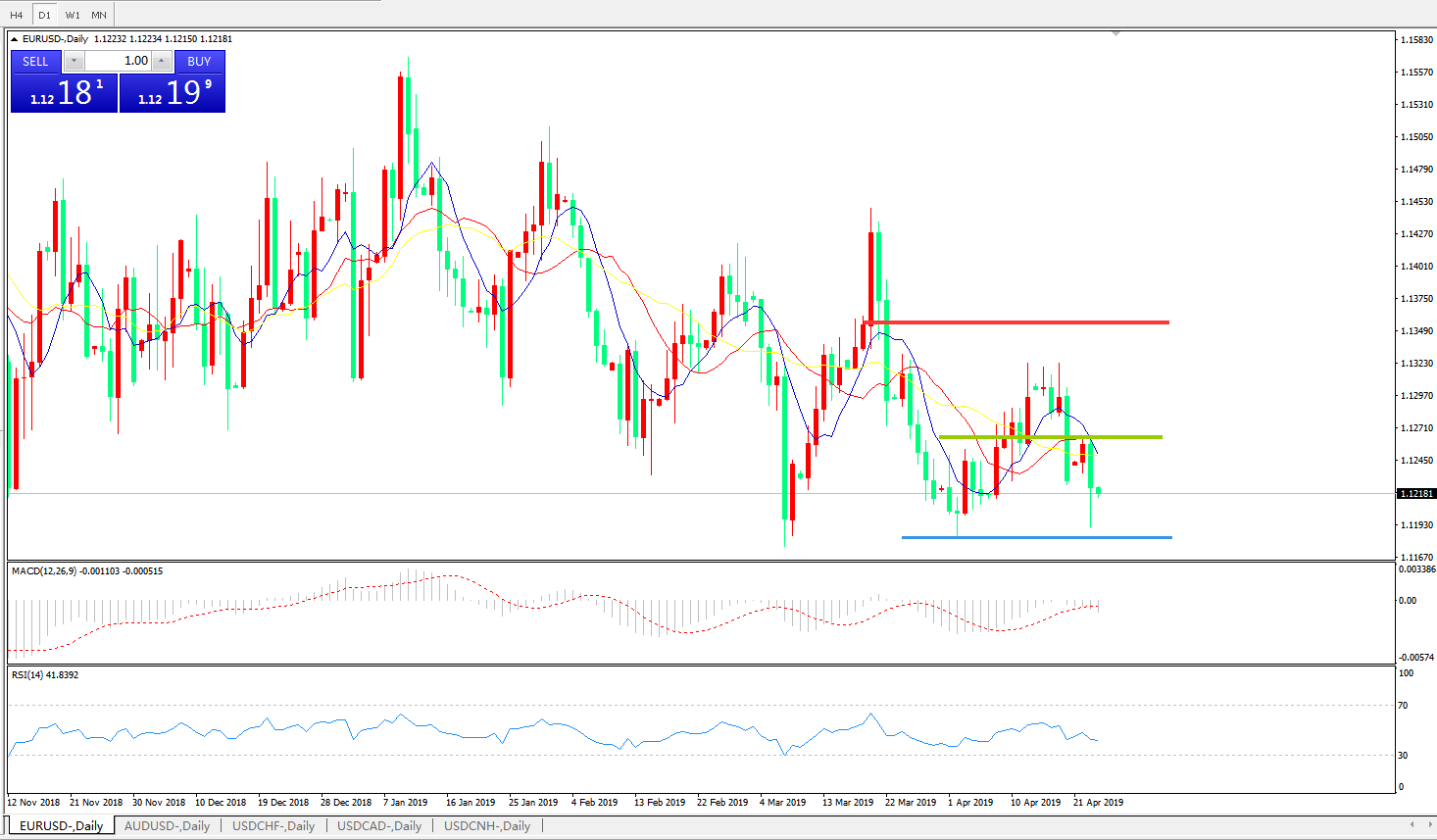 技术面简析:日图均线呈下行态势,汇价再次骤跌一度试探前期低点,MACD在0轴下方运行且动能柱开始放量,RSI逐步走低,预计汇价将进一步走低,试探下方低点区域附近支撑。