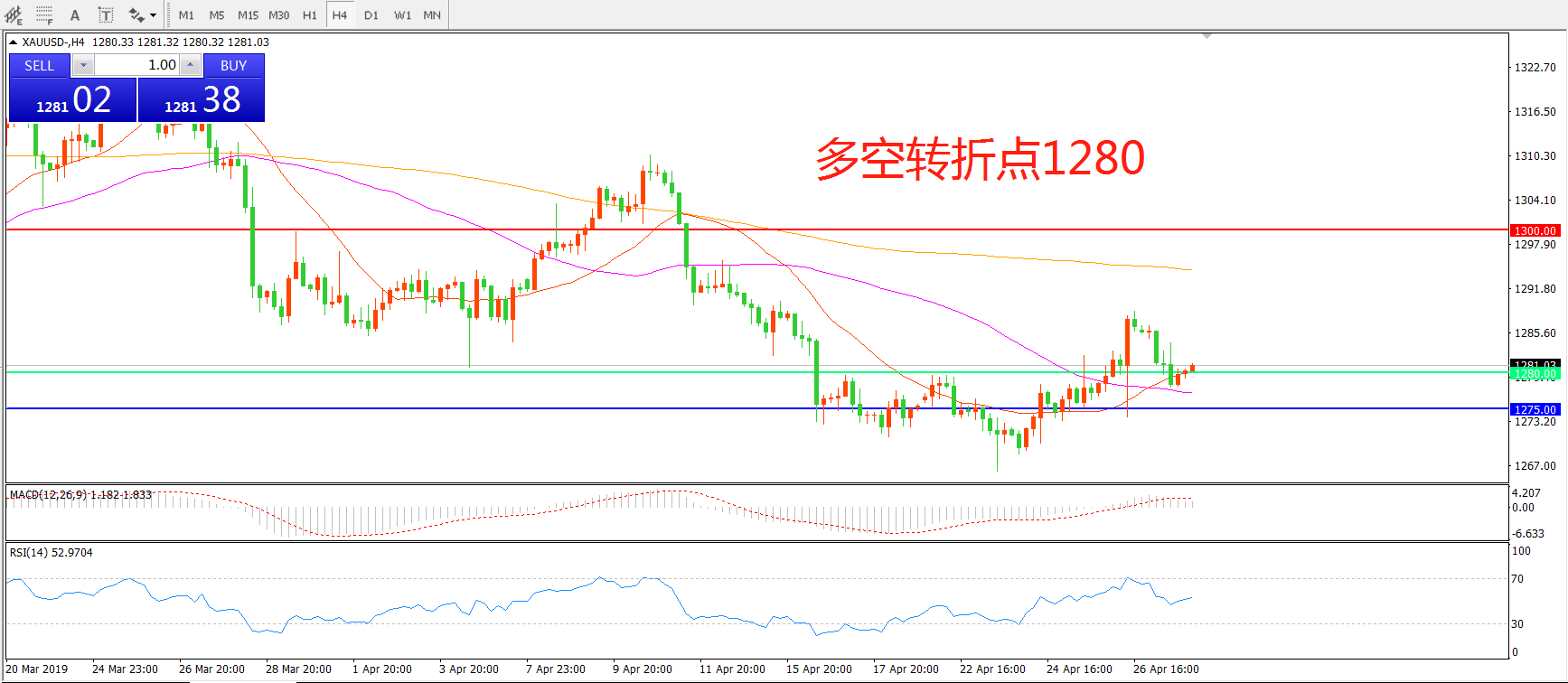 4小时图看,金价冲高后震荡回落,但整体依然维持在多空分水岭之上,均线上穿形成金叉, MACD红柱缩短,RSI指标拐头向上,1280成为短期支撑,震荡上行是大概率事件。