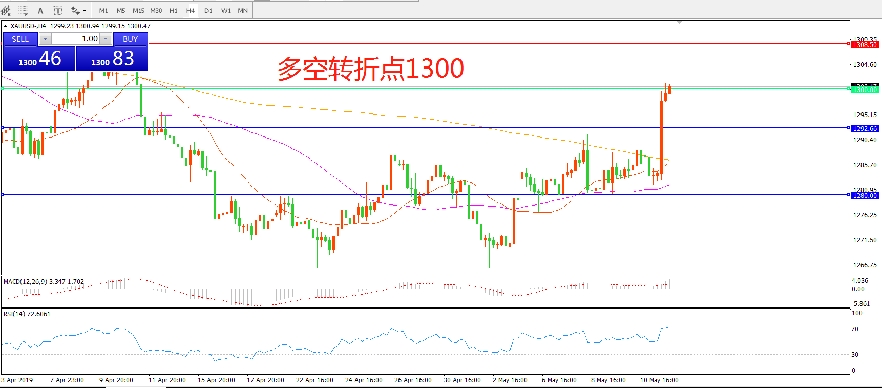 5月13日周一,人民日报报道,根据《中华人民共和国对外贸易法》《中华人民共和国进出口关税条例》等法律法规和国际法基本原则,经党中央、国务院批准,国务院关税税则委员会决定,自2019年6月1日0时起,对已实施加征关税的600亿美元清单美国商品中的部分,提高加征关税税率,分别实施25%、20%或10%加征关税。对之前加征5%关税的税目商品,仍继续加征5%关税。消息一出,市场避险情绪急剧升温, 现货黄金强势走高,重新返回千三关口之上。