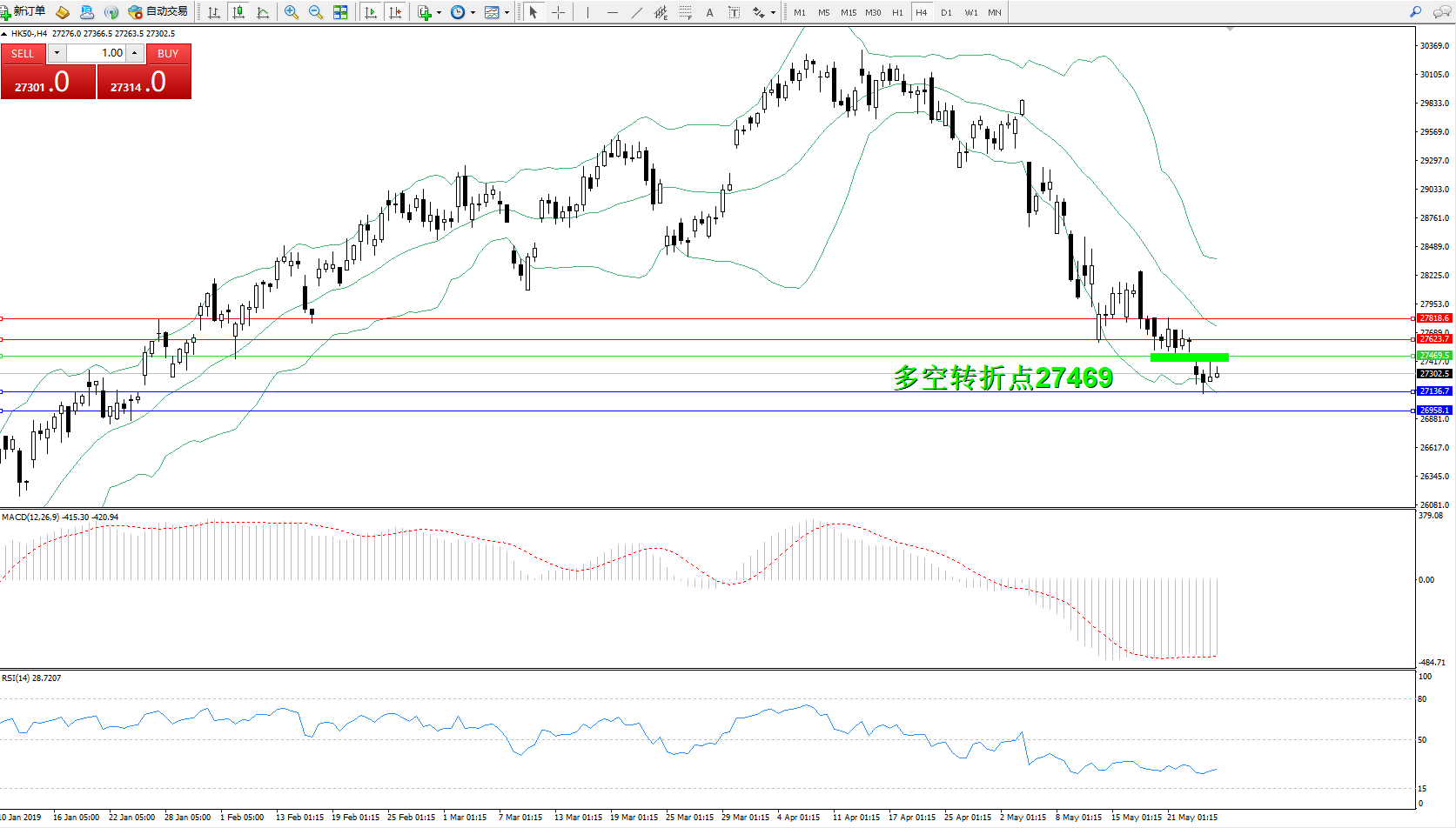 内地股市早盘冲高回落后,维持震荡格局,上证综指微涨0.02%,收于2852.99点,周线跌1.02%,连续5周下跌;香港恒生指数小幅高开后在平盘线上方窄幅震荡,截至收盘微涨0.32%,报27353.93点,周线跌2.12%,连续三周下跌。市场不明朗因素仍多,成交量低位运行,说明短线风险仍未释放完毕。弱势格局暂时难以扭转,后市走势预计仍会反复,投资者需保持耐心,不宜过度进取入市。28000点关口一时难以收复,意味着恒指或有可能再进一步下试27000点水平。