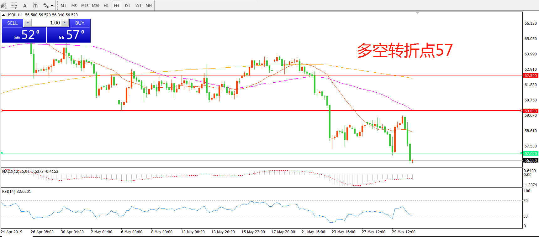 交易策略:在57.00  之下看跌,目标55.00    52.50