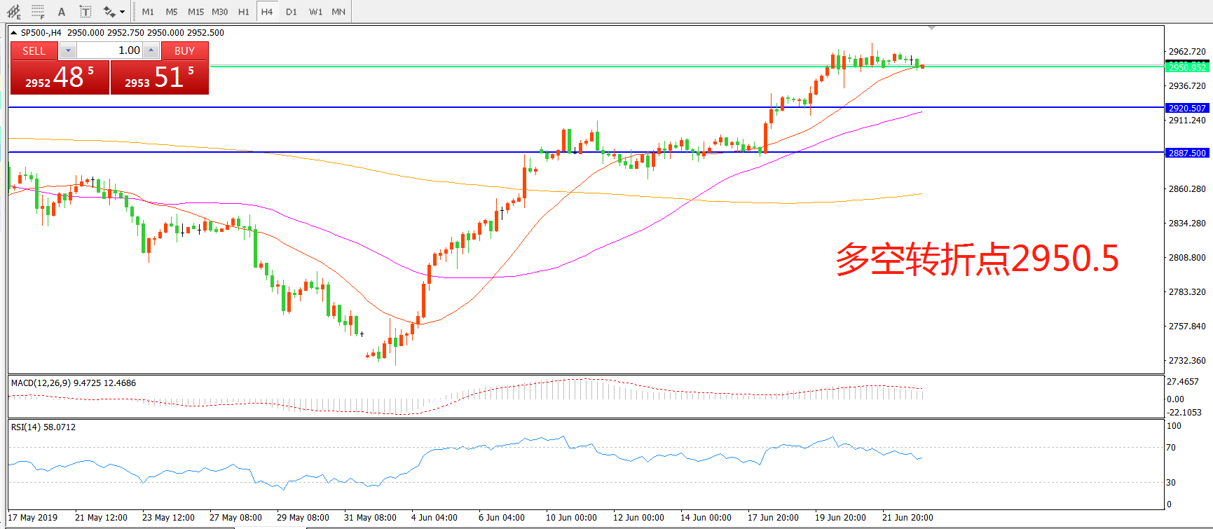 4小时图看,标普连续上行后维持高位窄幅震荡,均线系统呈多头排列,MACD红柱减少,RSI指标向下,短期有回落风险。