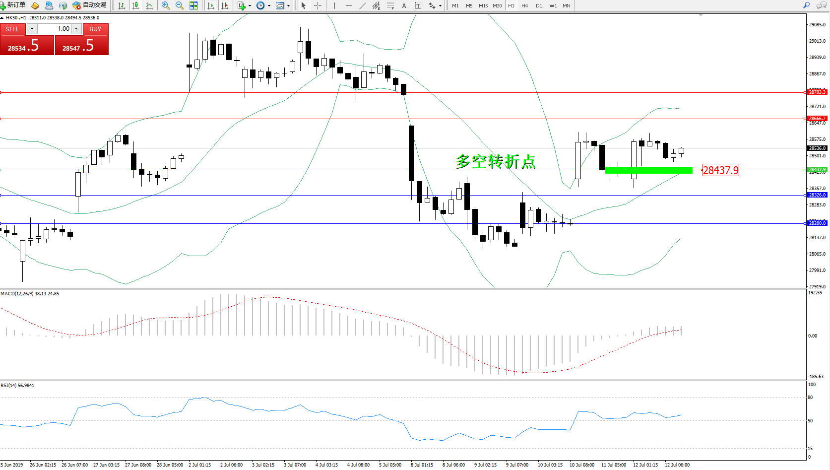 香港恒生指数7月12日(周五)收盘上涨39.82点,涨幅0.14%,报28471.62点;美股道指、标指创新高,恒指周四受消息刺激恒指低开高走,随后续在高位上横行。市场憧憬减息再度升温,美股再创新高。有多家投资看好中资股前景。做成股市窄幅上落。昨日成交金额减少至675亿元,更未能配合。估计短期内仍会在窄幅区间内波动。