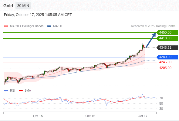 在 4280.00 之上,看涨,目标价位为 4410.00 ,然后为 4450.00 。
