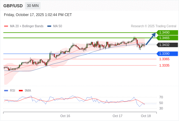 在 1.3390 之上,看涨,目标价位为 1.3465 ,然后为 1.3490 。