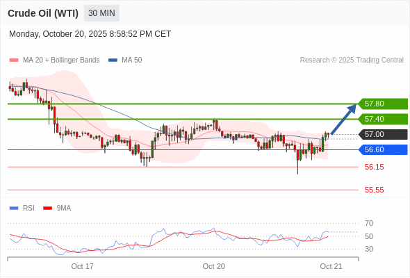 在 56.60 之上,看涨,目标价位为 57.40 ,然后为 57.80 。