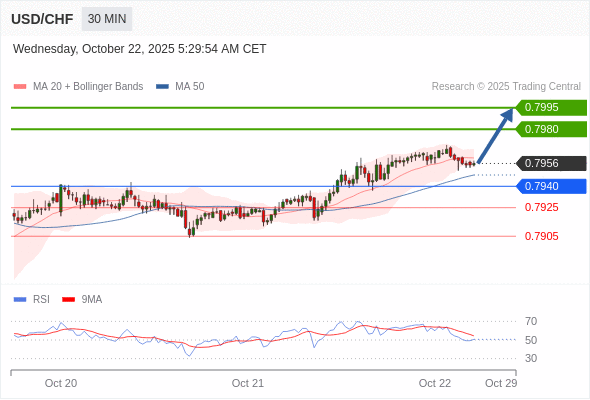 美元/瑞郎 当日内: 在0.7940之上,看涨。
