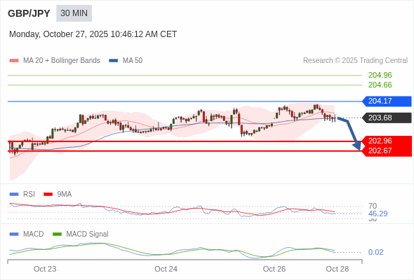 英镑/日元 当日内 : 逐渐下跌,当 204.17 阻碍上行,则 202.67 为目标位。