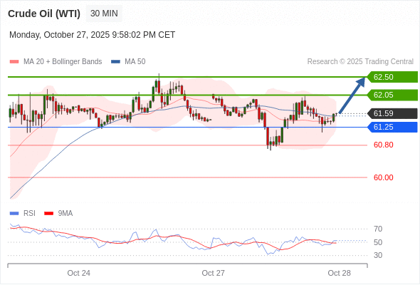在 61.25 之上,看涨,目标价位为 62.05 ,然后为 62.50 。