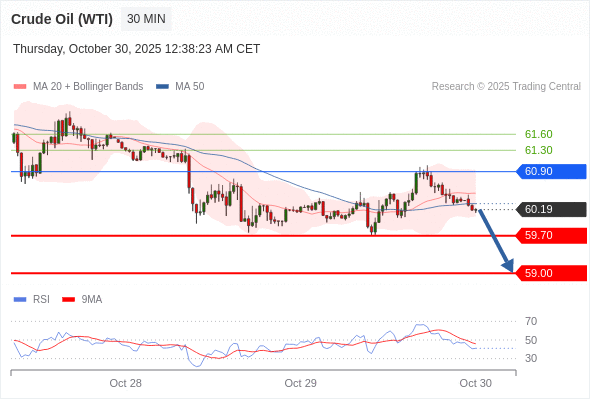 交易策略: 在 60.90 之下,看跌,目标价位为 59.70 ,然后为 59.00 。