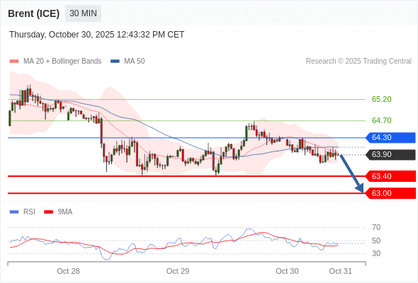 在 64.30 之下,看跌,目标价位为 63.40 ,然后为 63.00 。