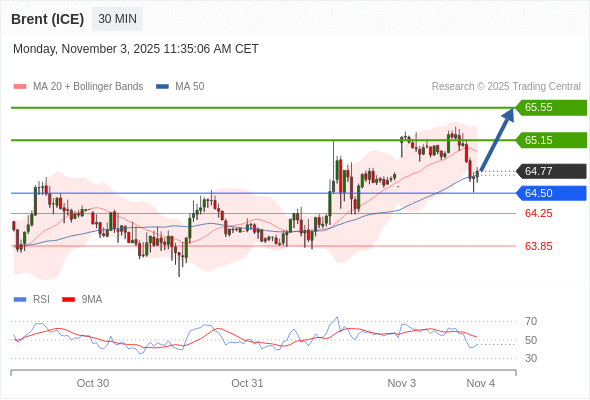 在 64.50 之上,看涨,目标价位为 65.15 ,然后为 65.55 。
