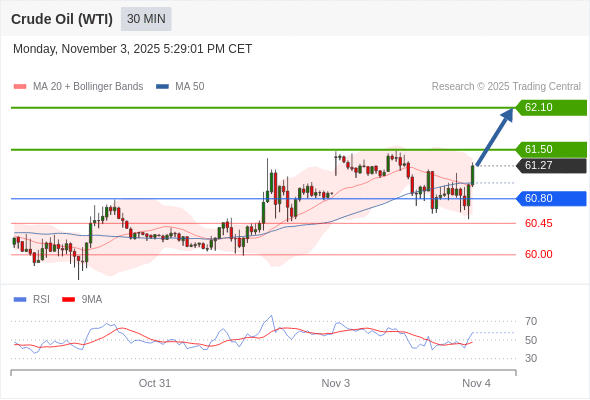 在 60.80 之上,看涨,目标价位为 61.50 ,然后为 62.10 。