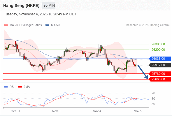 交易策略: 在 26035.00 之下,看跌,目标价位为 25760.00 ,然后为 25660.00 。