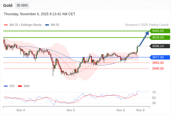 在 3977.00 之上,看涨,目标价位为 4028.00 ,然后为 4045.00 。