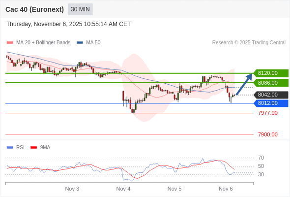 法国CAC指数期货 (Euronext) (X5) 当日内: 超短线(当日内)支撑位在8012.00附近。