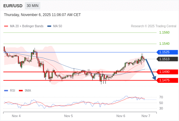 欧元/美元 当日内: 短期关键阻力位在1.1525。