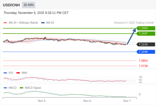 备选策略: 如跌破 7.1048 ,USD/CNH 目标方向定在 7.0854 和 7.0738 。