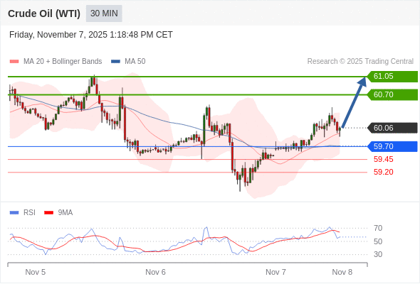 在 59.70 之上,看涨,目标价位为 60.70 ,然后为 61.05 。