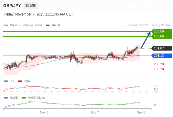 英镑/日元 当日内: 看涨,当 201.13 为支撑位。