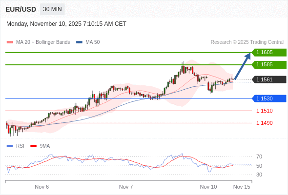 欧元/美元 当日内: 在1.1530之上,看涨。