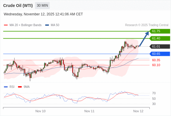 在 60.65 之上,看涨,目标价位为 61.40 ,然后为 61.75 。
