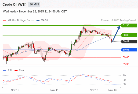 在 60.05 之上,看涨,目标价位为 60.80 ,然后为 61.30 。