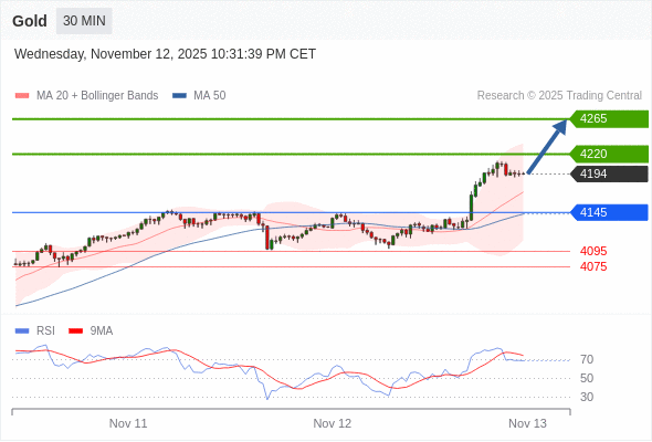 在 4145 之上,看涨,目标价位为 4220 ,然后为 4265 。