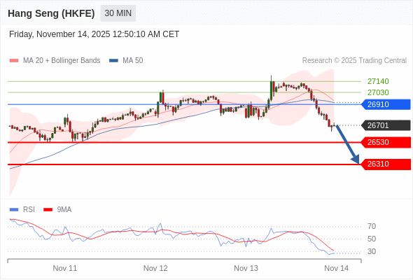 香港恒生指数期货 当日内: 下跌趋势。