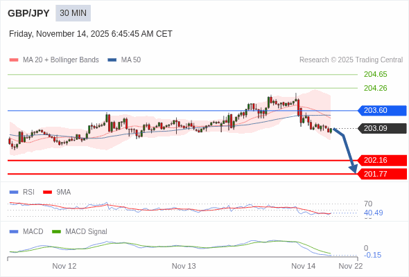 英镑/日元 当日内 : 看跌,在 203.60 之下。
