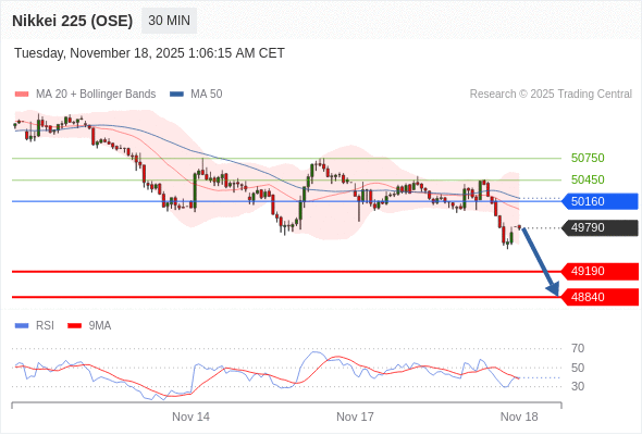 在 50160 之下,看跌,目标价位为 49190 ,然后为 48840 。