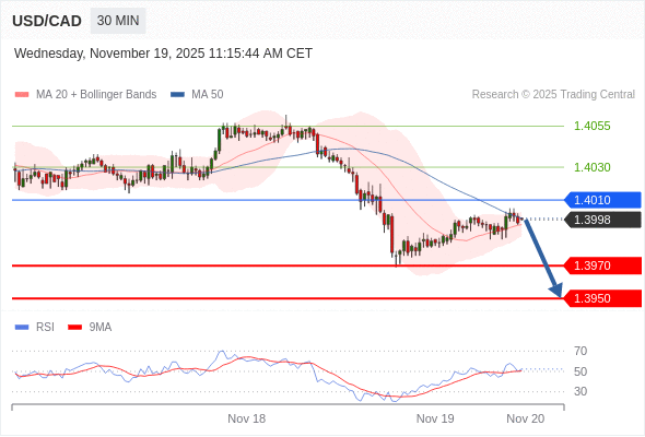 在 1.4010 之下,看跌,目标价位为 1.3970 ,然后为 1.3950 。
