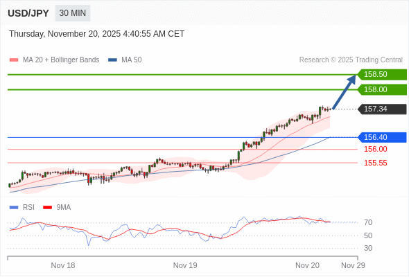 在 156.40 之上,看涨,目标价位为 158.00 ,然后为 158.50 。