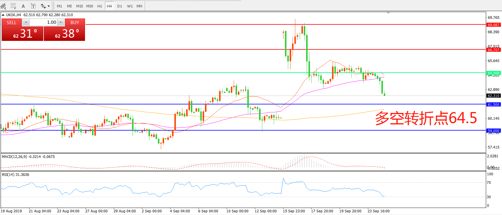 交易策略:在64.50之下看跌,目标61.50   59.00