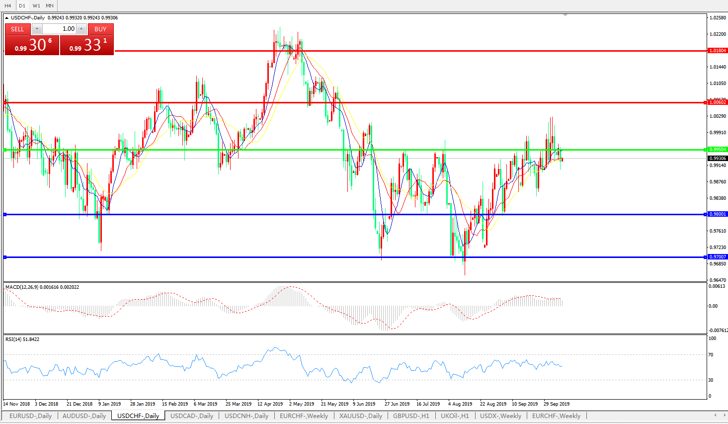 交易策略:0.9950下方看跌,目标0.9800、0.9700