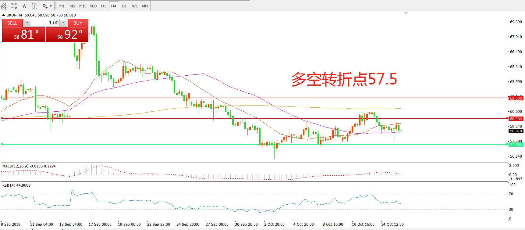 4小时图看,油价整体呈现窄幅震荡,多空力量较为胶着,均线系统走平,MACD红柱缩短,RSI指标向下,重点关注57.5一线的支撑情况。