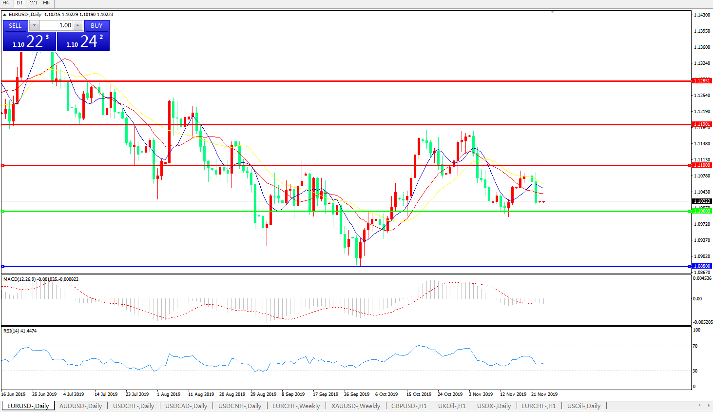 技术面简析:日图均线再度呈空头排列,汇价延续弱势继续大幅走低,MACD开始转弱,RSI持续走弱,预计汇价短期回落将遭遇下方重要支撑,关注1.1000关口争夺。