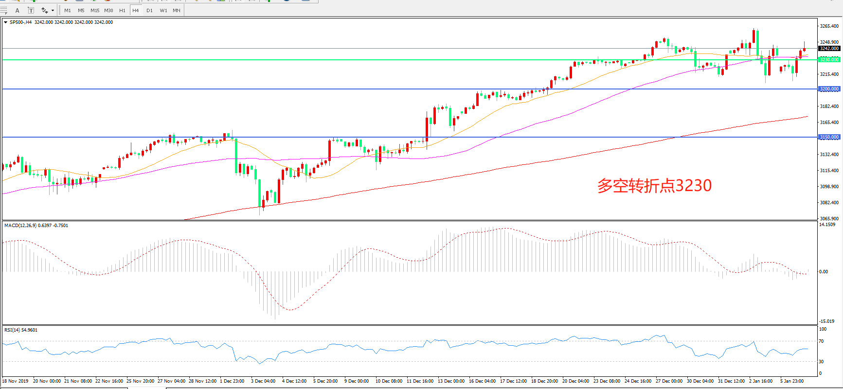 4小时图看,标普500延续高位震荡,未来拉升后再度回到均线支撑之上,均线系统走平,MACD红柱增加,RSI指标走平,日内延续震荡概率较大。