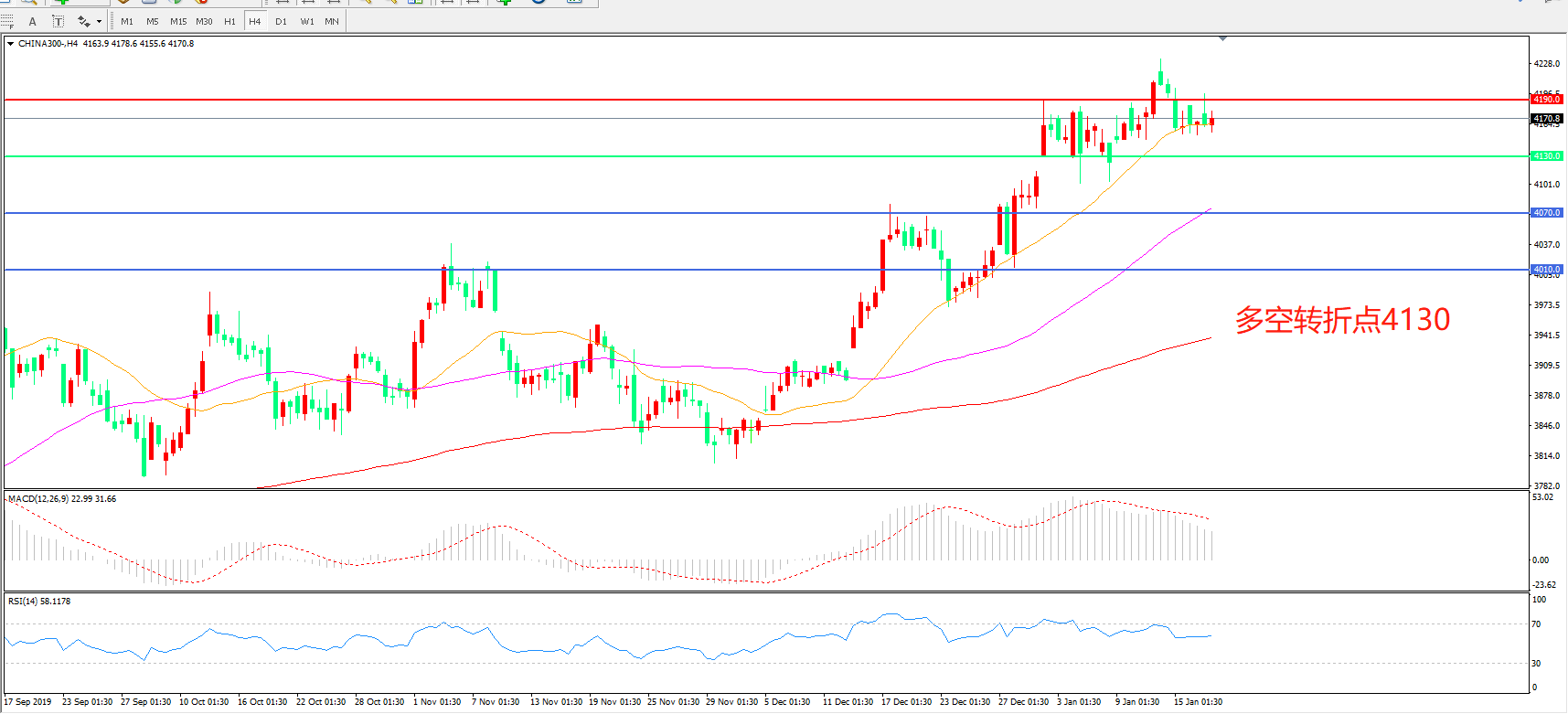 4小时图看, 沪深300维持高位震荡,整体波幅不大,均线系统呈多头排列,MACD红柱减少,RSI指标走平,日内震荡上行概率较大。