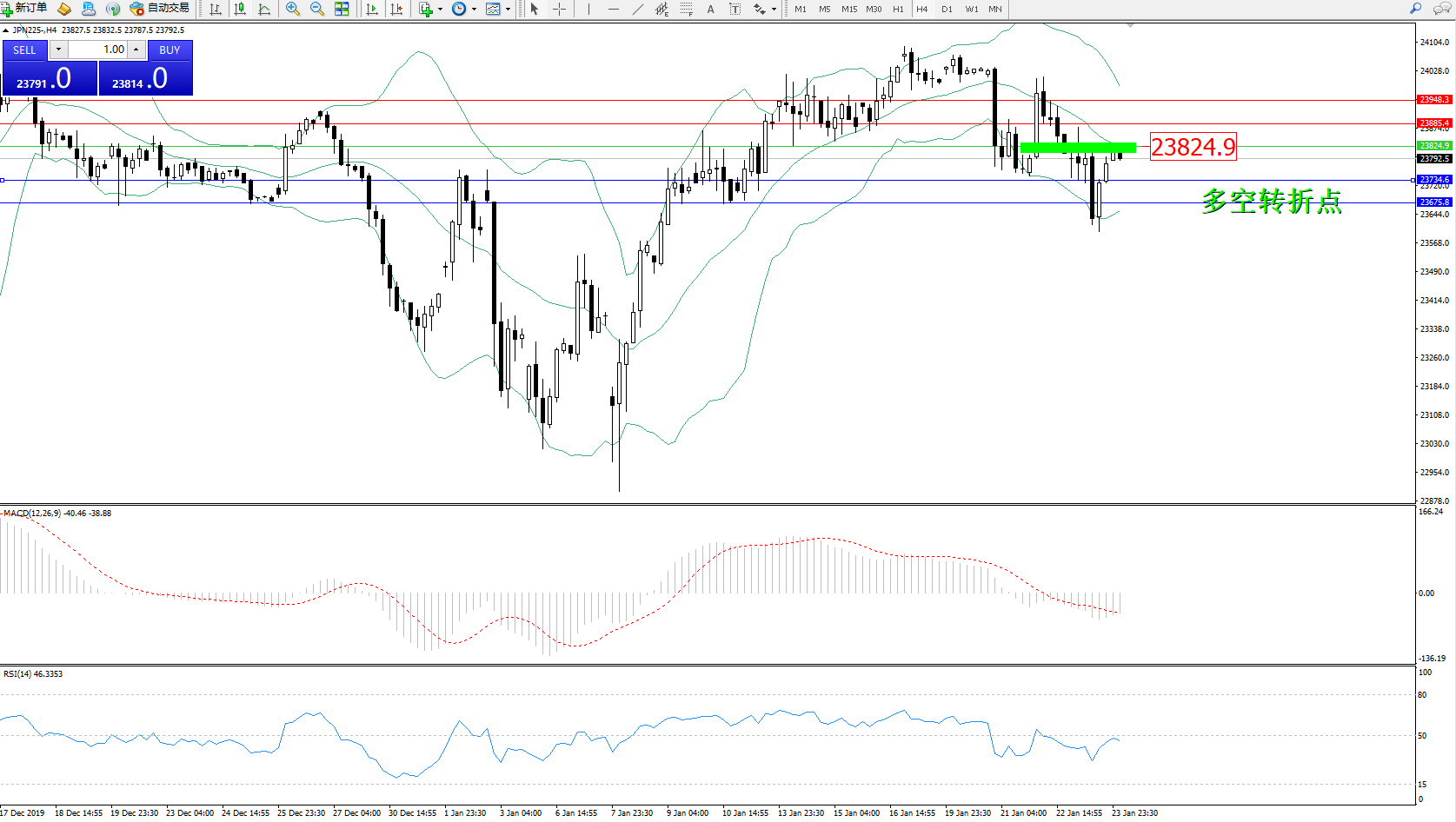 日经225指数1月23日(周四)收盘下跌236.35点,跌幅0.98%,报23795.00点。因受冠状病毒疫情消息发酵影响,日内亚洲股市普跌,日本12月出口连续第13个月减少,受对美国出口汽车、建筑和矿业机械下滑的拖累,表明外部需求疲弱正抑制依赖出口的日本经济。日本财务省周四公布的数据显示,12月出口较上年同期减少6.3%,降幅大于路透调查分析师预估的减少4.2%。11月出口同比减少7.9%。上周签署的第一阶段贸易协议以及英国退欧有所进展,将有助缓和围绕全球贸易的担忧。全球贸易是驱动日本经济的一大力量。不过,最新数据显示萎缩步伐只是温和放缓,表明可能还需数月才能出现根基稳固的复苏。