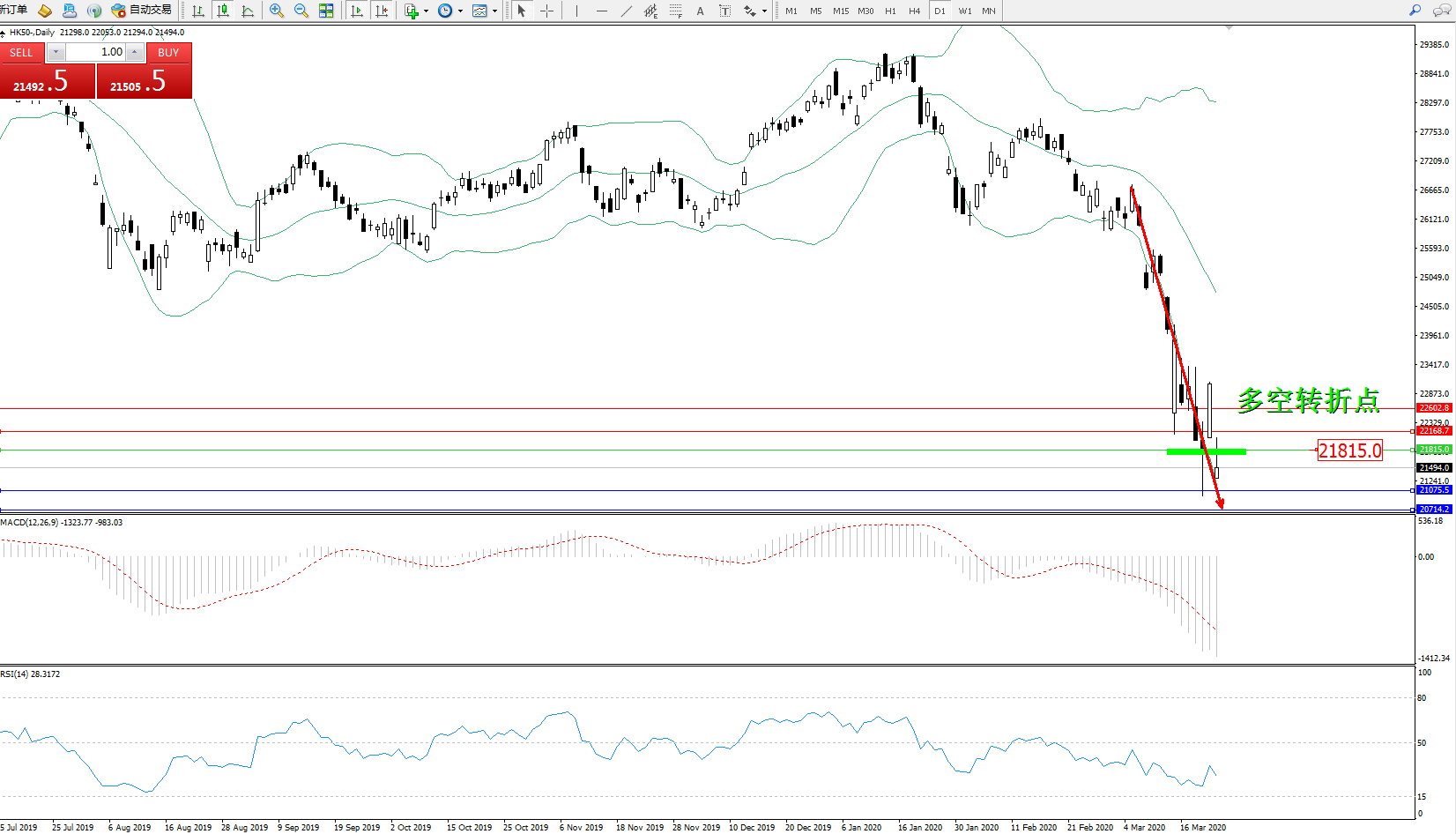 香港恒生指数323日(周一)收盘下跌1108.94点,跌幅4.86%,报21696.13点;海外疫情持续严峻,全球金融市场跌势未止。今日港A两地市场集体大跌,港股全日呈现大跌行情,行业板块近乎全部下跌。蓝筹权重股集体重挫。市场再度陷入恐慌之中。主板成交量为1375.49亿港元,港股通大幅净流入102.81亿港元。多项数据显示,香港经济环境正在不断恶化,零售销售已连续12个月呈现价量齐跌。香港现时的经济环境比2003年“非典”时期更加严峻。多个行业的中小企业正承受生意断崖式下跌、资金链断裂、裁员的危机。香港经济正处于水深火热之中。