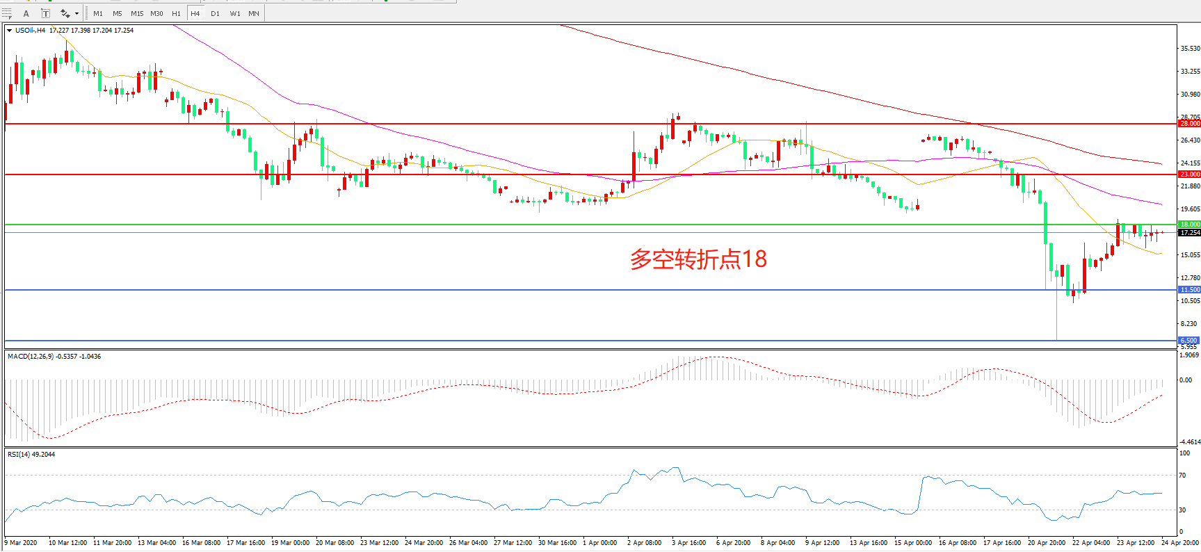 4小时图看,油价维持窄幅震荡,18美元成为短期阻力,均线系统仍呈空头排列,MACD绿柱缩短,RSI指标走平,日内震荡下行概率较大。