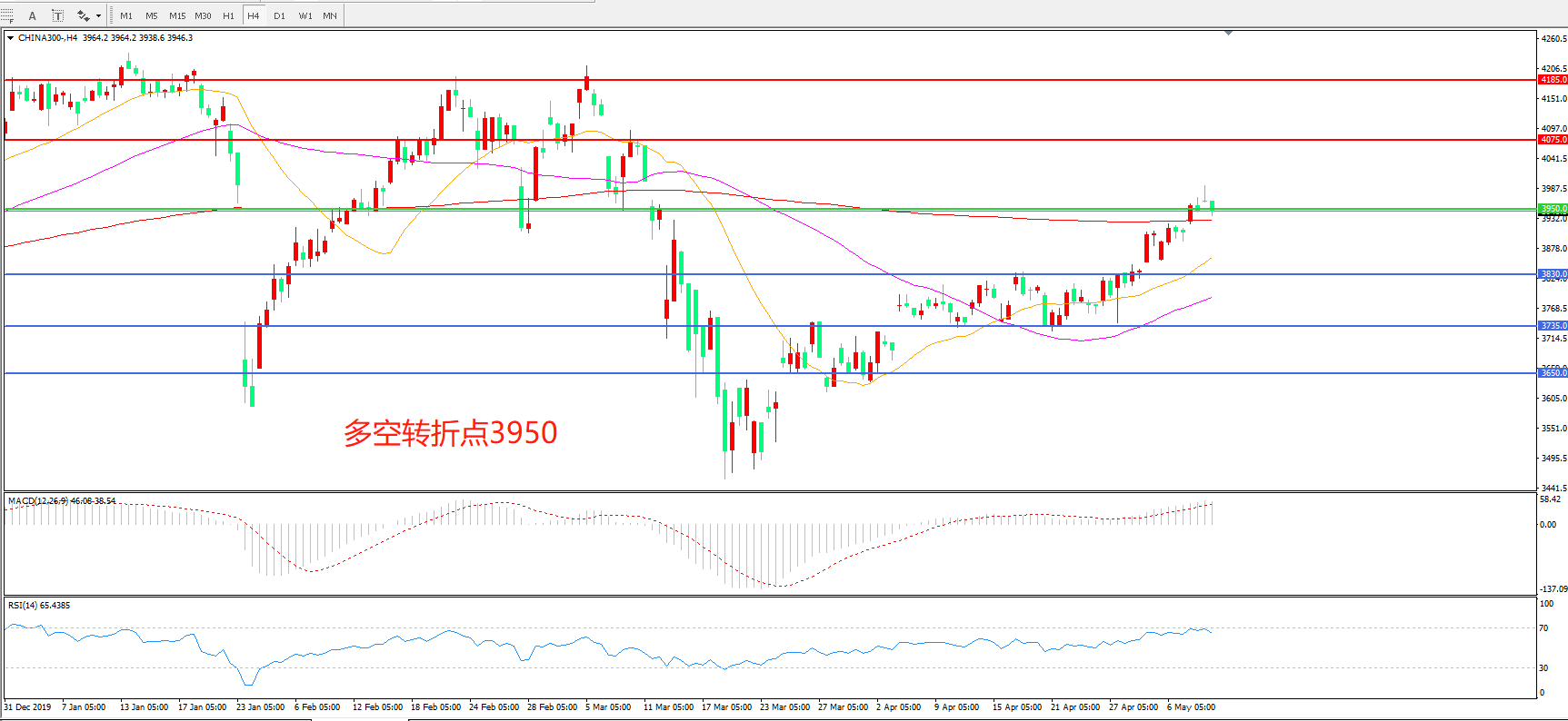 4小时图看,沪深300高开低走,短期涨势有所回落,但上行形态依然完好,短期均线拐头向上,200周期均线成为下方支撑,MACD红柱增加,RSI指标走平,日内延续上行概率较大。