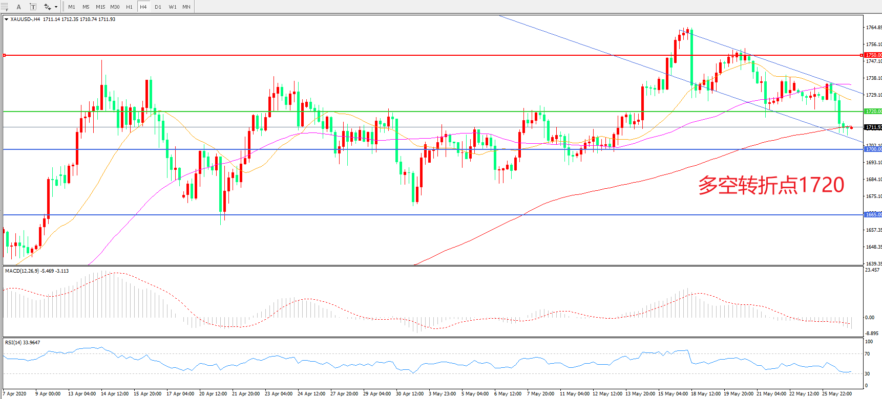 周二(5月26日),尽管市场对经济复苏的担忧,以及全球央行的极度宽松的货币政策支撑着金价,但是市场似乎对各种因A出现“审美疲劳”的迹象,昨日美盘时段,现货黄金急跌约20美元,收报1711.58美元/盎司,金价有再次测试1700美元的可能性。