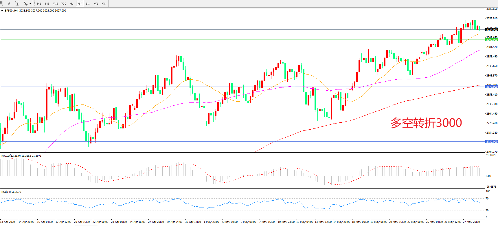 4小时图看,标普500冲高回落,短期走势有所放缓,但整体仍处于上升区间, 3000点支撑附近支撑依然强劲,均线系统呈多头排列,MACD红柱增加,RSI指标走平,日内延续上行概率较大。